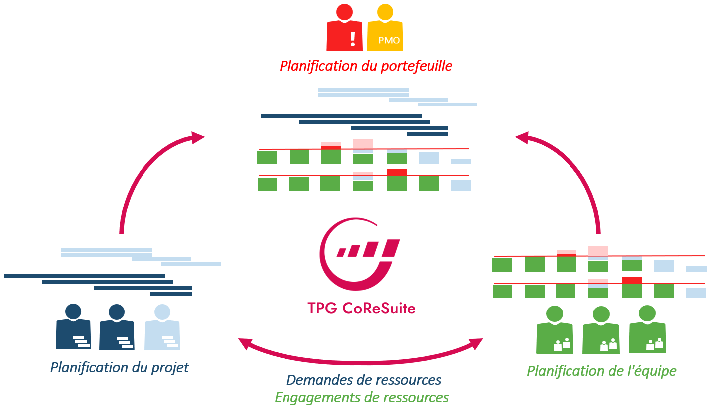 L'interaction des rôles et de leurs outils dans TPG CoReSuite fournit à la direction de l'entreprise une vue d'ensemble précieuse du degré d'utilisation des ressources. Cela leur permet d'identifier les surcharges et les disponibilités et d'optimiser le portefeuille de projets et l'utilisation.