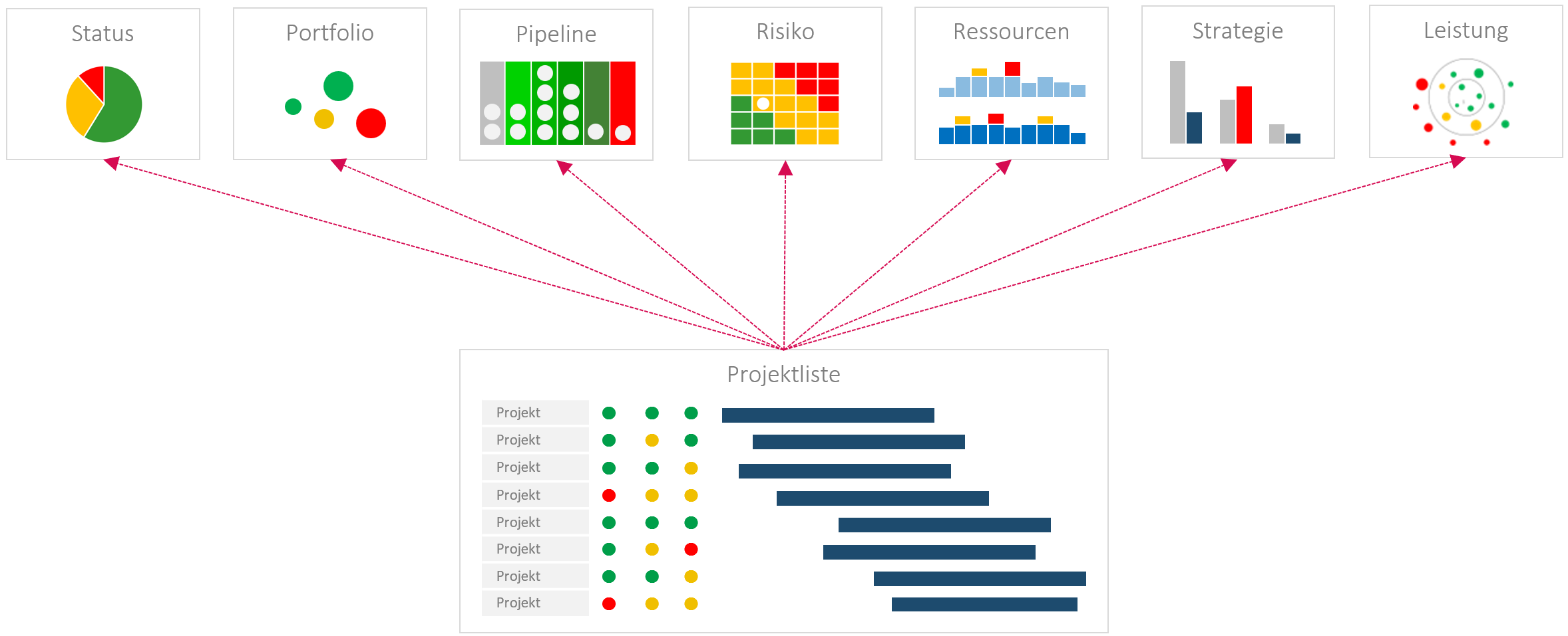 Nutzen Sie ein datenbankbasiertes PPM-Tool wie z.B. Project Online, so ist eine Projektliste schon in der Grundausstattung mit dabei. Diese können Sie beliebig gruppieren und verschiedene Ansichten definieren. So haben Sie einen schnellen Überblick über alle interessanten Informationen zu den Einzelprojekten, z.B. symbolisiert durch Ampeln.
