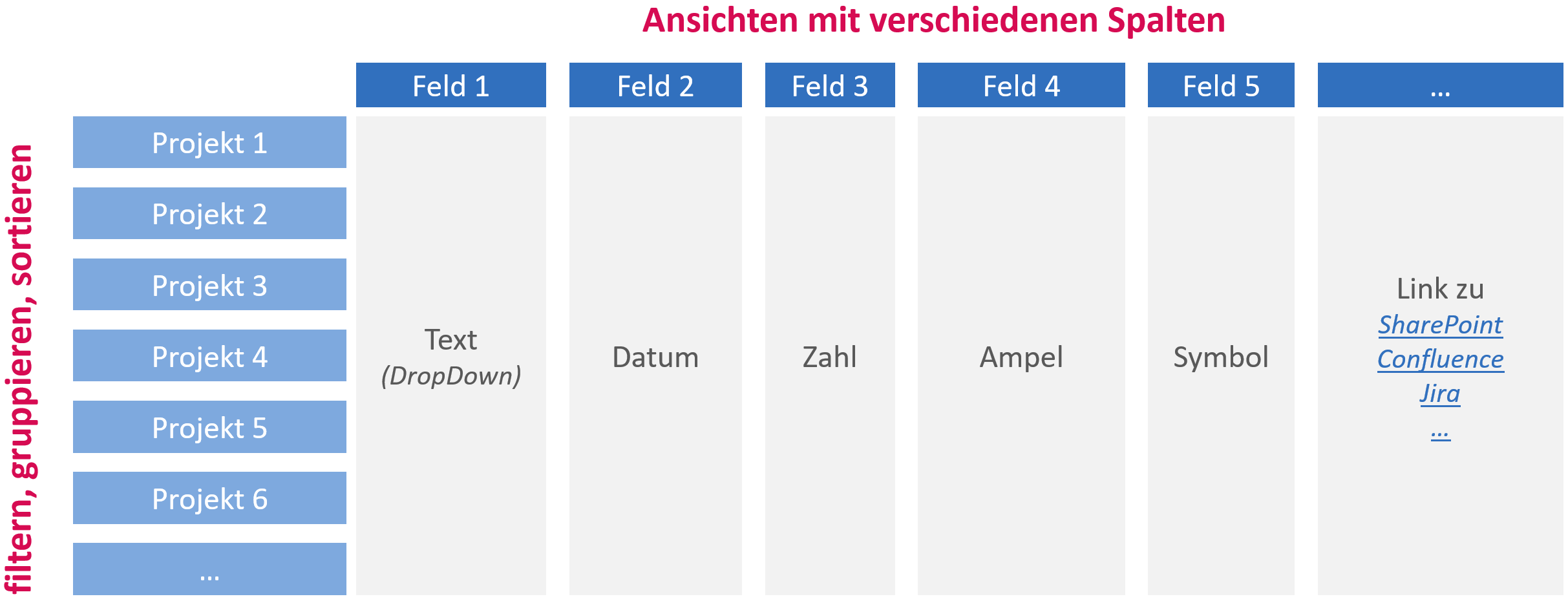 Starten Sie bei der Idee für eine Projektliste am besten pragmatisch mit einer Skizze – die Projekte untereinander. In den Spalten arrangieren Sie anschließend weitere Informationen, die unterschiedliche Feldtypen umfassen werden (Datum, Freitext, Zahlen, Ampeln mit welcher Berechnungslogik, Symbole / Indikatoren wie Pfeile, Links zu weiteren Dokumenten oder Werkzeugen, …).