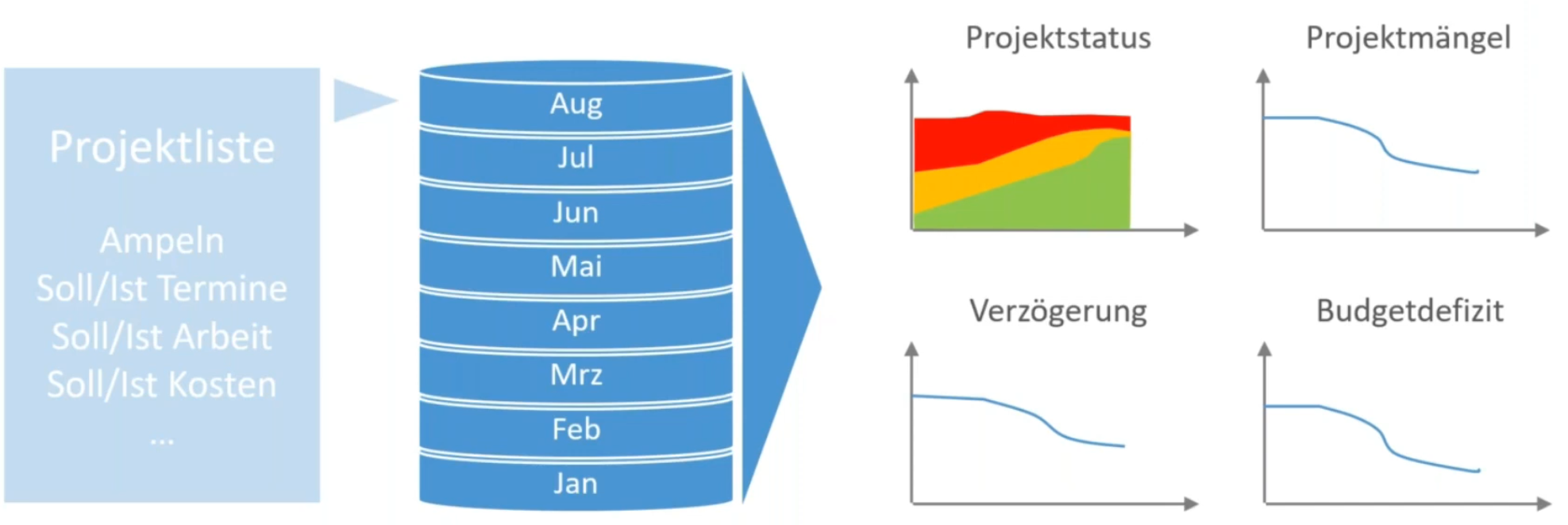 Aus den montlichen Daten können Sie interessante Berichte ziehen. Diese können Ihnen als Nachweis dienen, dass Ihr Projektmanagement schrittweise besser wird. Beispielsweise wären hierzu folgende Fragestellungen auswertbar: