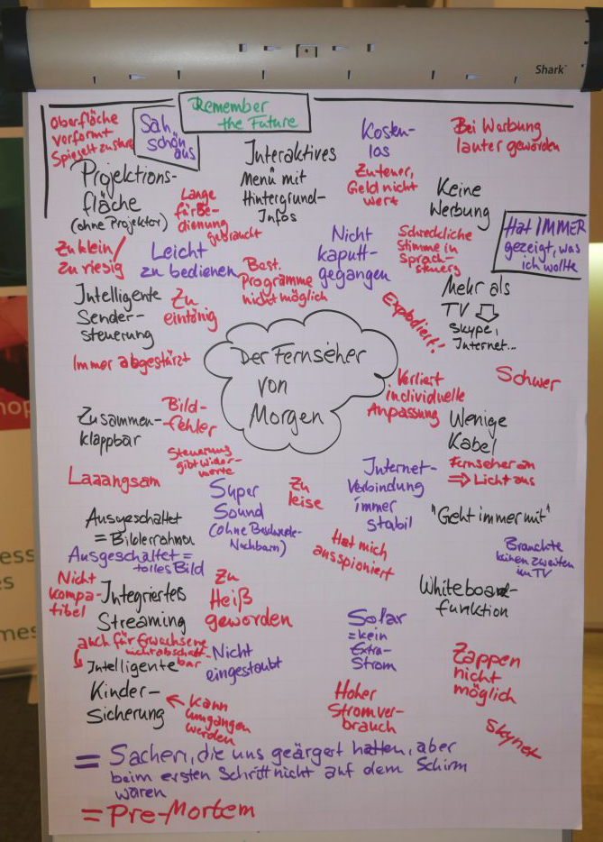 Hirnforscher konnten nachweisen, dass der Perspektivenwechsel (wir stellen uns vor, wir wären bereits in der Zukunft und schauen zurück) dafür sorgt, dass die Beteiligten die Szenarien viel konkreter und kreativer durchspielen als bei reinem vorausschauendem Brainstorming.