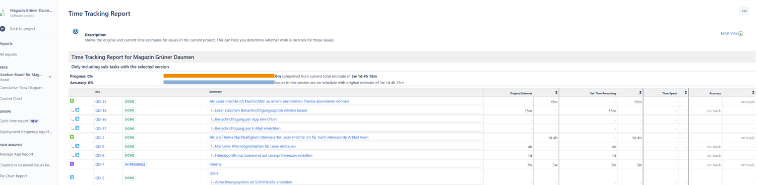 Das „Time tracking“-Feld in Jira-Issues dient zur Erfassung von Plan- und Ist-Bearbeitungszeiten. Wenn diese regelmäßig und gut gepflegt sind, lassen sich Berichte über Zeiterfassungen und Arbeitslast erstellen (siehe folgende Screenshots).