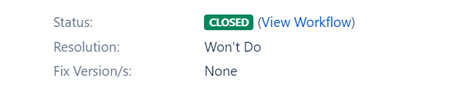 Grundsätzlich bietet Jira die Möglichkeit, bei einem „Resolved“- oder „Closed“-Zustand mit einem „Fixed“ oder „Won’t Do“ im Resolution-Feld die getroffene Entscheidung für oder gegen die Umsetzung eines Änderungswunsches transparent zu machen. Voraussetzung dafür ist, dass das „Resolution“-Feld im Projekt von der Jira-Administration als bearbeitbar konfiguriert wurde.