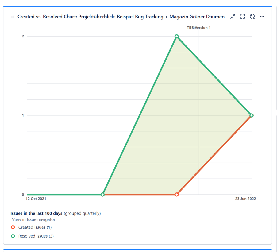 - Created vs. Resolved: Zeigt in einer Übersicht, wie viele Issues in einem gewählten Projekt neu eröffnet wurden und wie viele fertiggestellt wurden. Auch dieses Gadget lässt sich über einen entsprechenden Filter, der mehrere Projekte umfasst, für mehr als ein Projekt einrichten. Das folgende Beispiel zeigt simulierte Daten aus der TPG-Trainingsinstanz. In aktiv und länger genutzten Produktivprojekten können Sie die Ergebnisse noch deutlich granularer darstellen. Sie können besonders dann hilfreich sein, wenn es um die Nachvollziehbarkeit der Effektivität von Fehlerbehebung in einem Produkt geht: