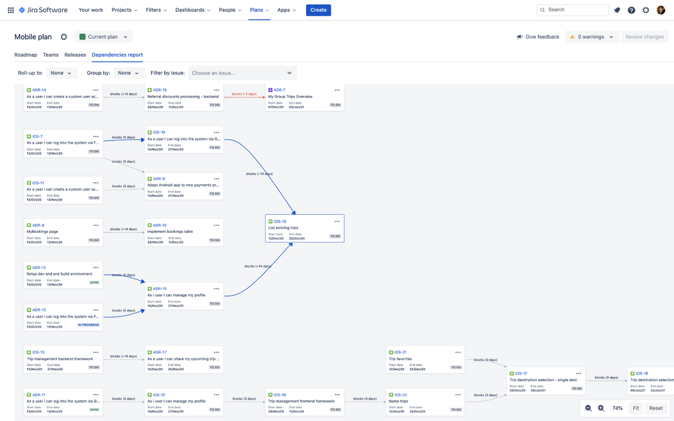 Richtig interessant für PMOs wird Jira Road Map mit der Advanced Road Map, die in Premium- und Enterprise-Lizenzen enthalten ist. Diese kann unter anderem auch Abhängigkeiten zwischen Issues feingranular darstellen und somit einen guten Überblick über den Stand der Arbeit in einem oder mehreren Projekten liefern.