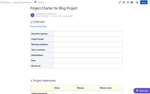 Nutzen Sie die „Project Kickoff“-Vorlage in Confluence. Alternativen sind die Templates “Project poster“, „Master project documentation“, „Project plan“ und einige weitere, die dieser ähnlich sind.