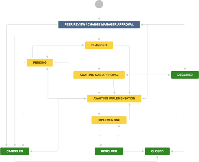Wenn Sie Jira Service Desk angebunden haben, finden Sie dort bereits einen eigenen Change-Workflow: Change management | Jira Service Management Cloud | Atlassian Documentation.