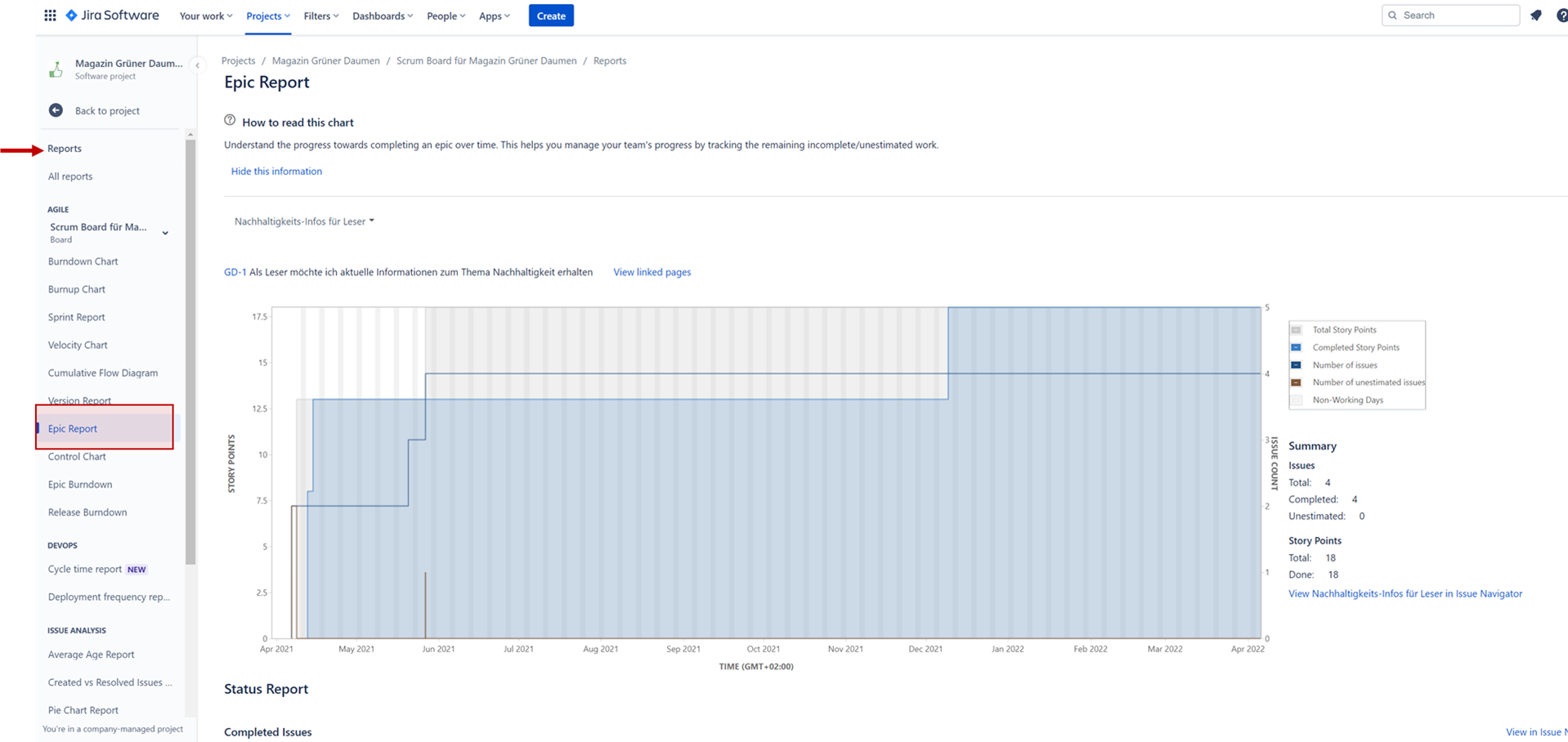 Reports in Jira lassen sich nur für ein bestimmtes Projekt erzeugen. Über die Projektseitenleiste gelangen Sie mit dem Punkt „Reports“ zu einer Vielzahl an Berichten. Solange die Daten in Ihren Projekten vorhanden und gut gepflegt sind, können diese bereits sehr aussagekräftig sein.