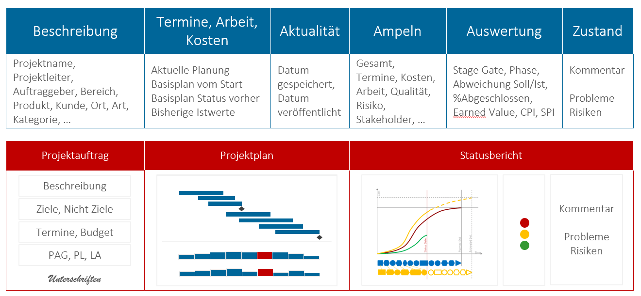- Information zu neuen Projekten: Projektauftrag mit Zielen, Terminen, Budget, Projektleitung, Ressourcen