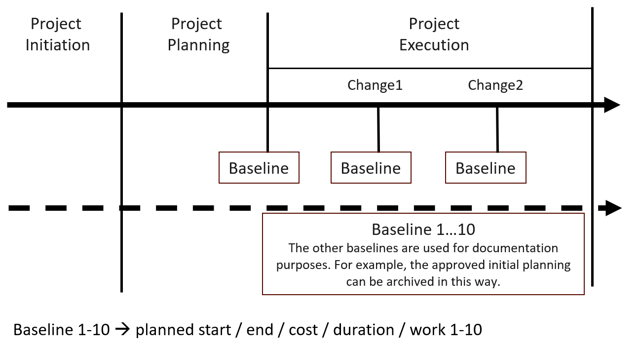 For this kind of target-actual comparison with MS Project, the tool provides the so-called baseline functionality with various reports. It allows you to save up to 11 baselines for your project. The first baseline is usually saved after the initial planning. During the implementation phase, you can save additional baselines.