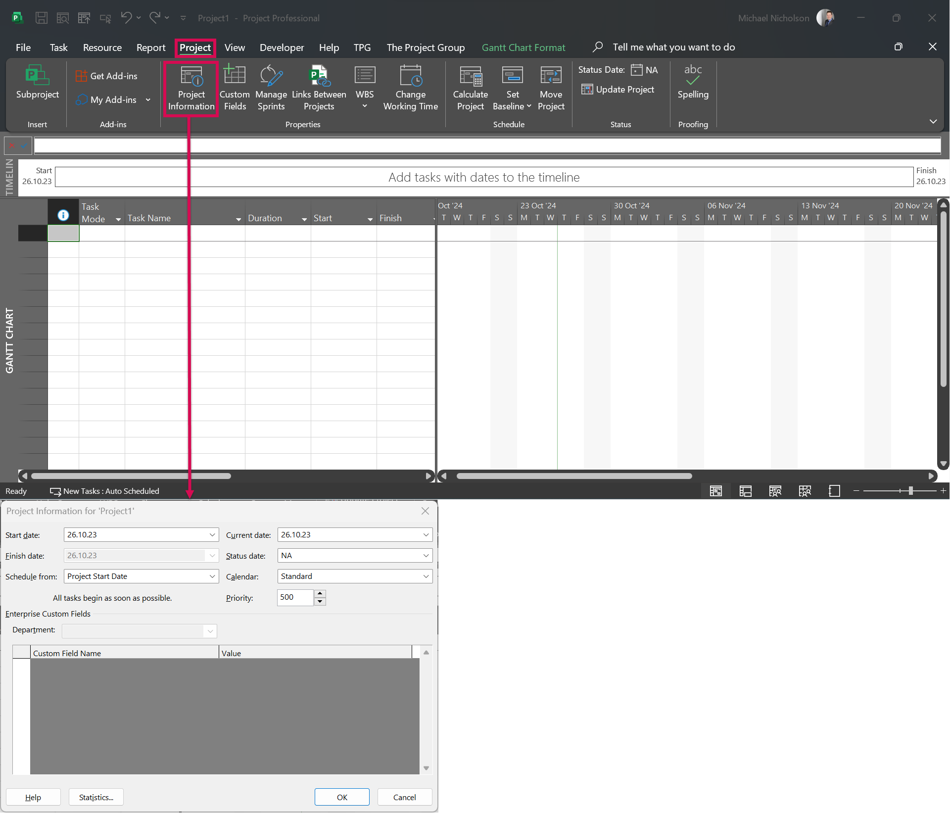 After creating your project, you start with Step 1 of our MS Project Tutorial – with entering the start date. This is particularly important, as MS Project sets the start of all newly created tasks to the project start date by default. Effectively, this means that: the calculation of the entire project is based on the project start date.