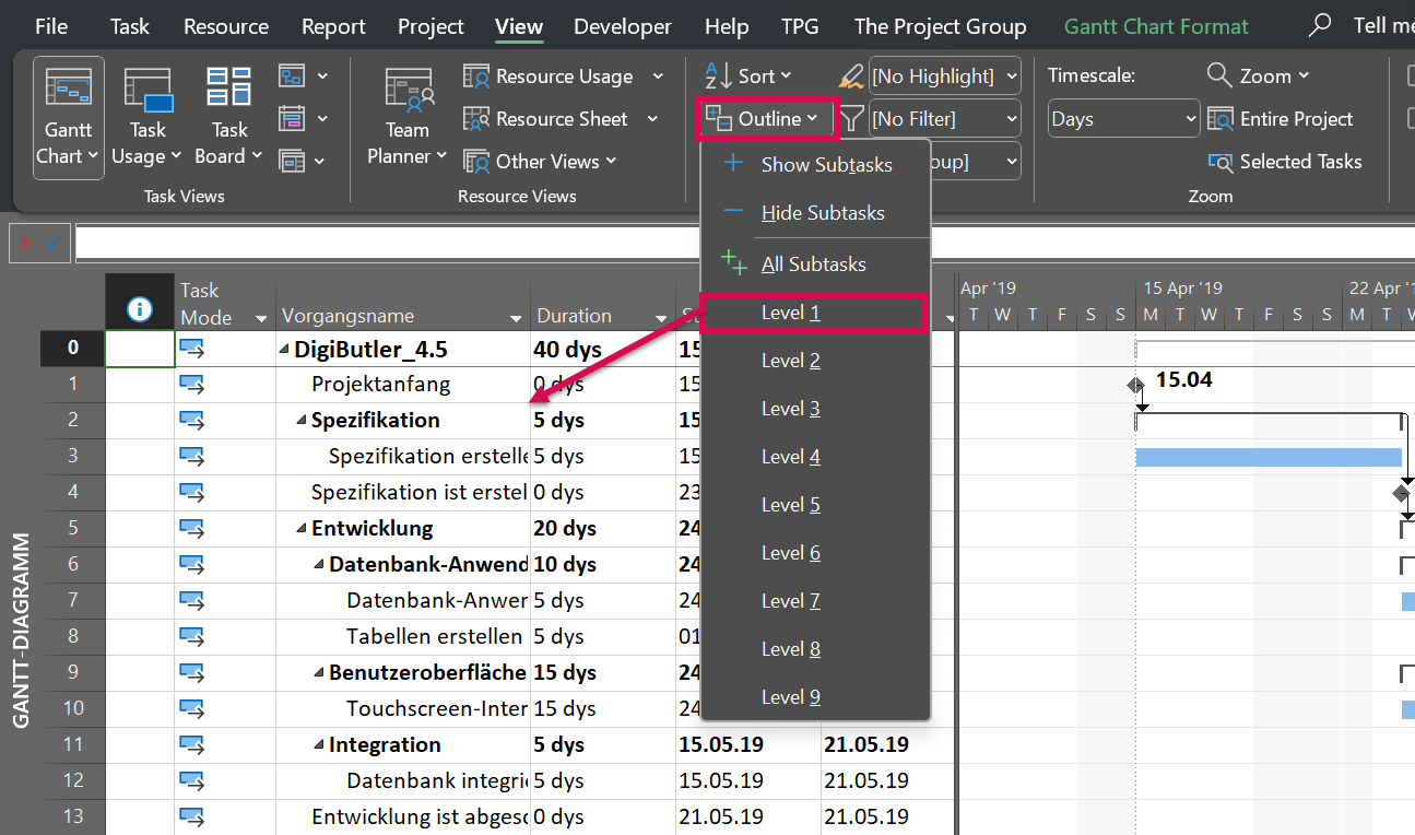 For instance, if you prefer an overview of the phases only, you can very easily limit your view to the first outline level. To do this, change to the View tab and activate the Outline button. Select the desired outline level next.