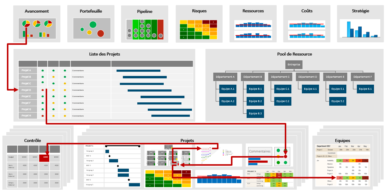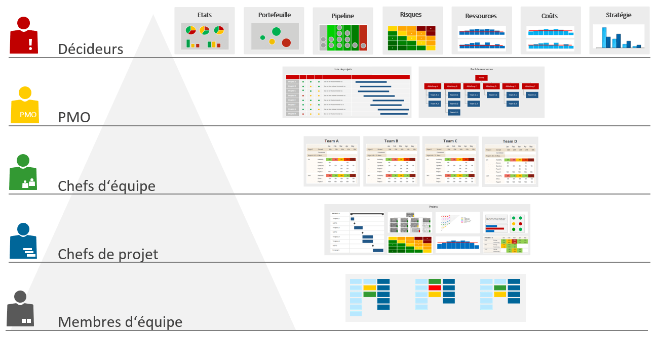 - Un PMO prépare souvent pour la direction les rapports projets et ressources au niveau du portefeuille. Le PMO a besoin d’une liste des projets avec les états d’avancement pour vérifier avec le chef de projet quand la génération du rapport est opportune. Tout problème nécessitant d’être remonté est présenté à la direction pour prise de décision.