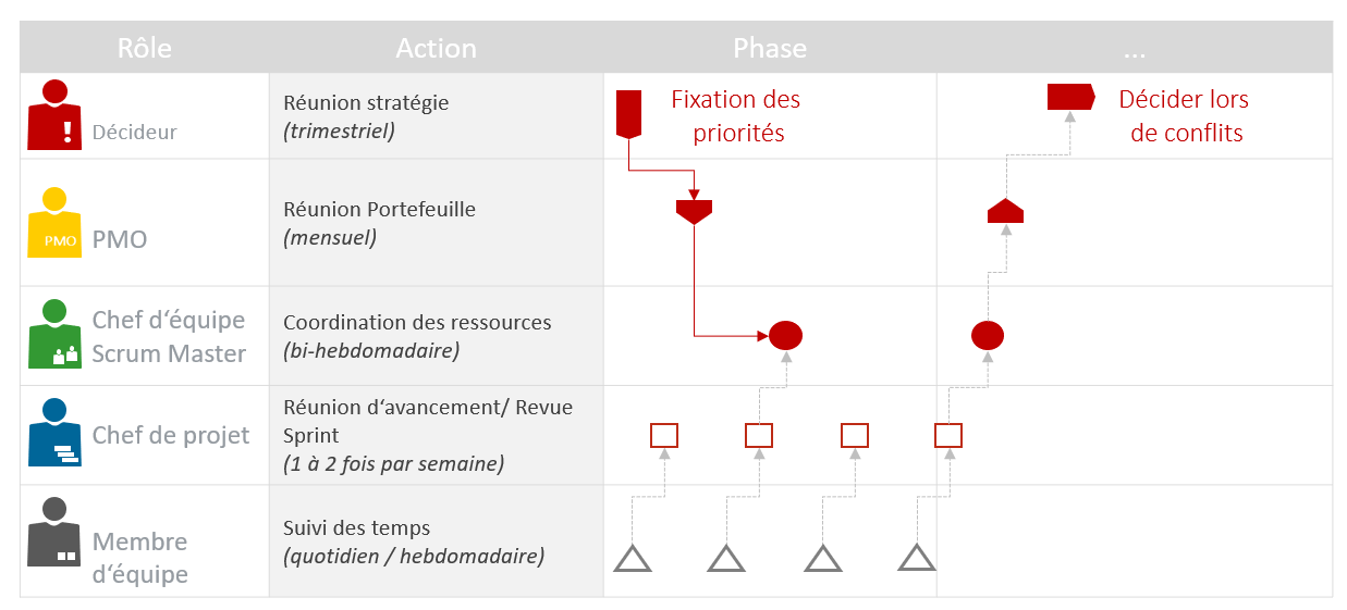 La graphique clarifie comment les périodes de reporting à chaque niveau résultent du cycle de réunions. Plus on monte dans la hiérarchie, plus l’information devient condensée. Dans le même temps, la fréquence du reporting décroit.