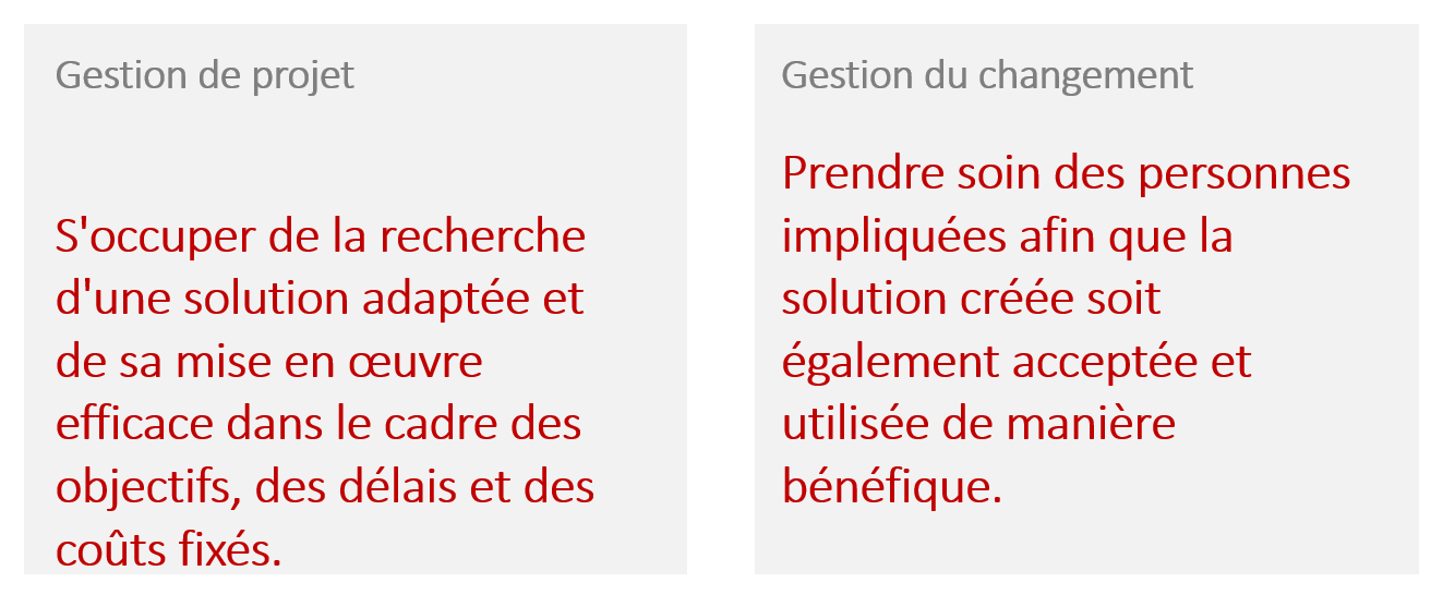 Pour que les projets soient couronnés de succès, il est indispensable d’aborder comme il se doit le processus de changement dans l’organisation, parallèlement à la mise en œuvre effective du contenu. C’est la tâche de la gestion du changement dans les projets.