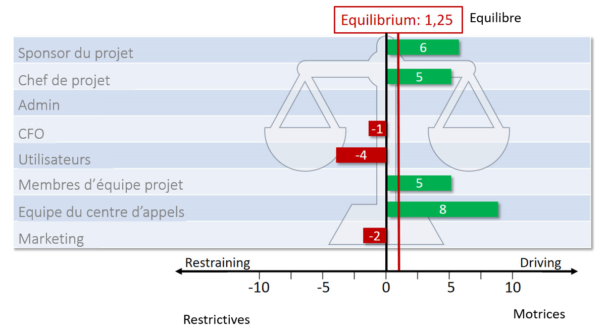Avec l’analyse du champ de forces, Kurt Lewin (1890-1947) a développé une représentation visuelle dans laquelle les forces motrices et restrictives se juxtaposent. Cela permet d’évaluer la probabilité de réussite d’un changement.