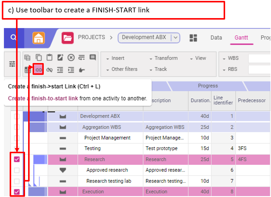 c) Utiliser la barre d’outils pour créer un lien FINISH-START
