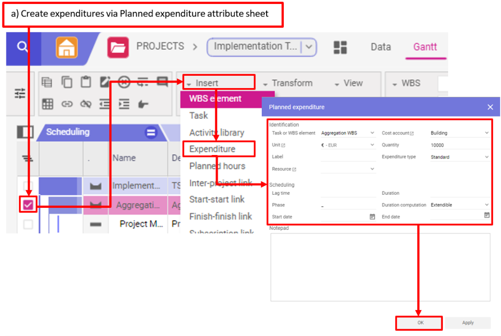- Sélectionnez Insérer – Dépenses (Insert – Expenditure) dans la barre d’outils pour ouvrir la feuille d’attributs des dépenses planifiées.
