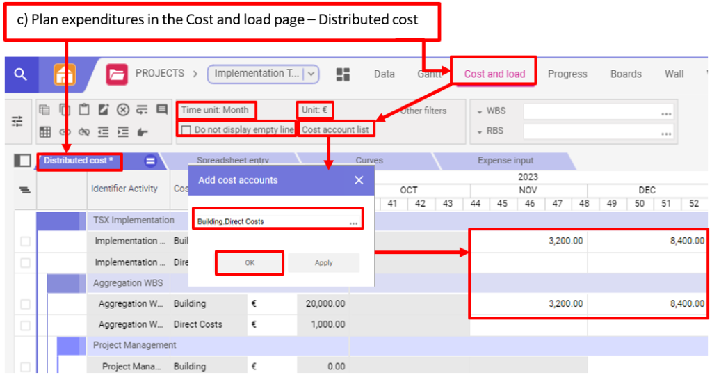 c) Prévoir les dépenses dans la page Coût et chargement – Coût réparti (Cost and Load page – Distributed cost)