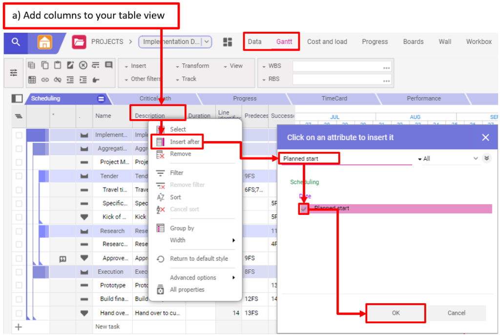 - Accédez à une vue de tableau dans la page Gantt ou Données et cliquez avec le bouton droit de la souris sur une colonne pour insérer des attributs supplémentaires, comme décrit à l’étape 10.