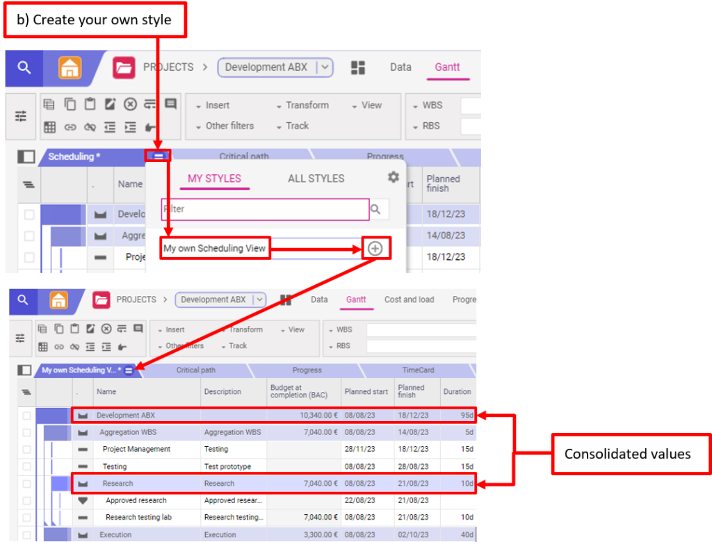 Pour visualiser les informations au niveau du projet ou du sous-project (WBS element), vous pouvez créer un style avec au moins les éléments suivants dans la page Gantt ou Données de votre projet :