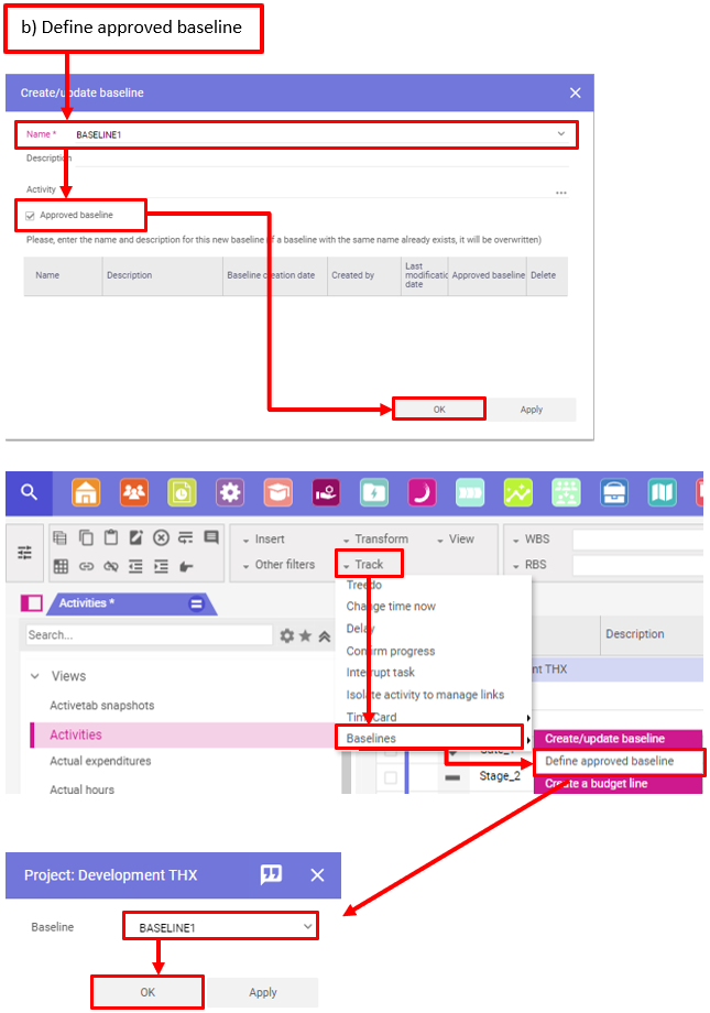 - Vous pouvez également cliquer sur Suivi – Baseline – Définir une baseline approuvée si vous avez déjà enregistré la baseline mais que vous ne l’avez pas marquée comme baseline approuvée.