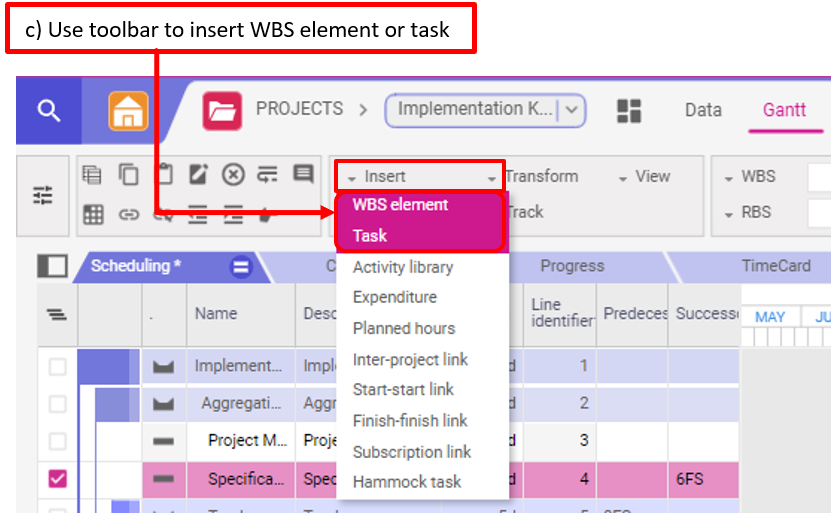 c) Utilisez Insérer un sous-projet (WBS element) ou Insérer une tâche (task) dans la barre d’outils.
