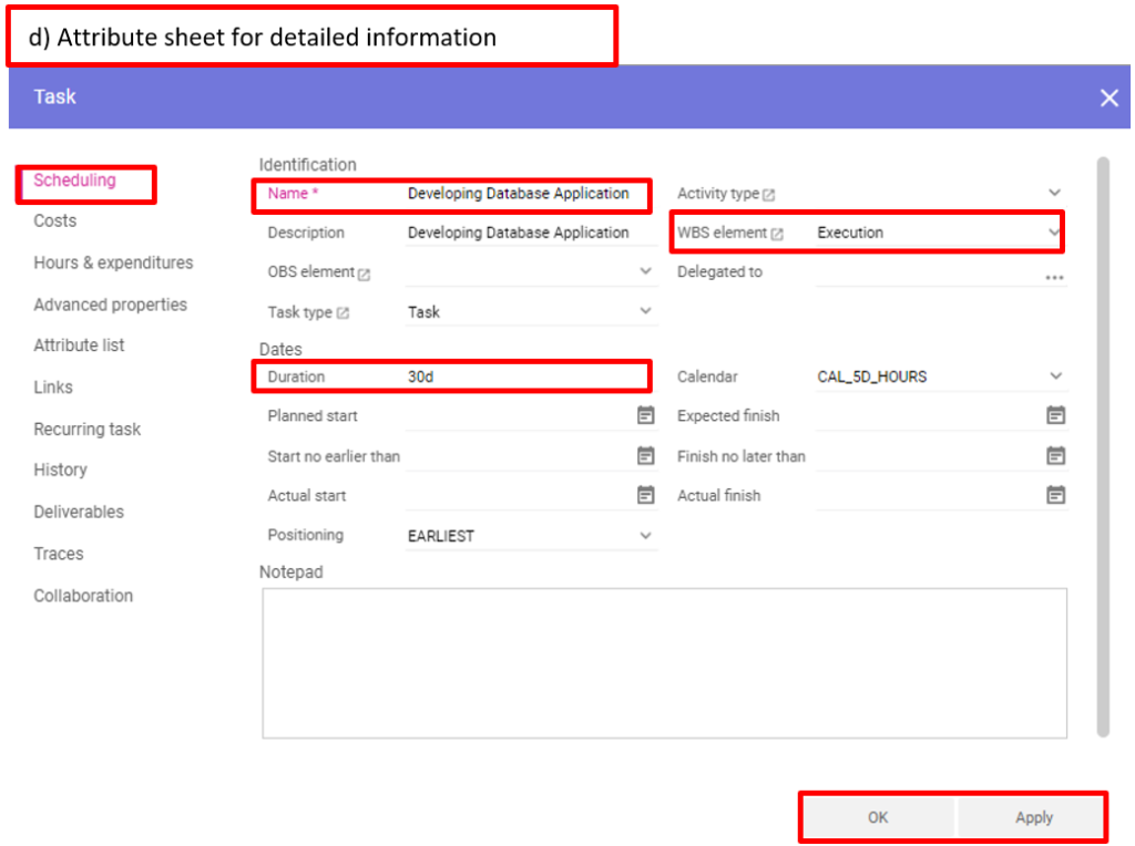 d) Si vous utilisez l’option b ou c, la feuille d’attribut du sous-projet ou de la tâche s’ouvrira automatiquement et vous pourrez y inscrire des informations détaillées.
