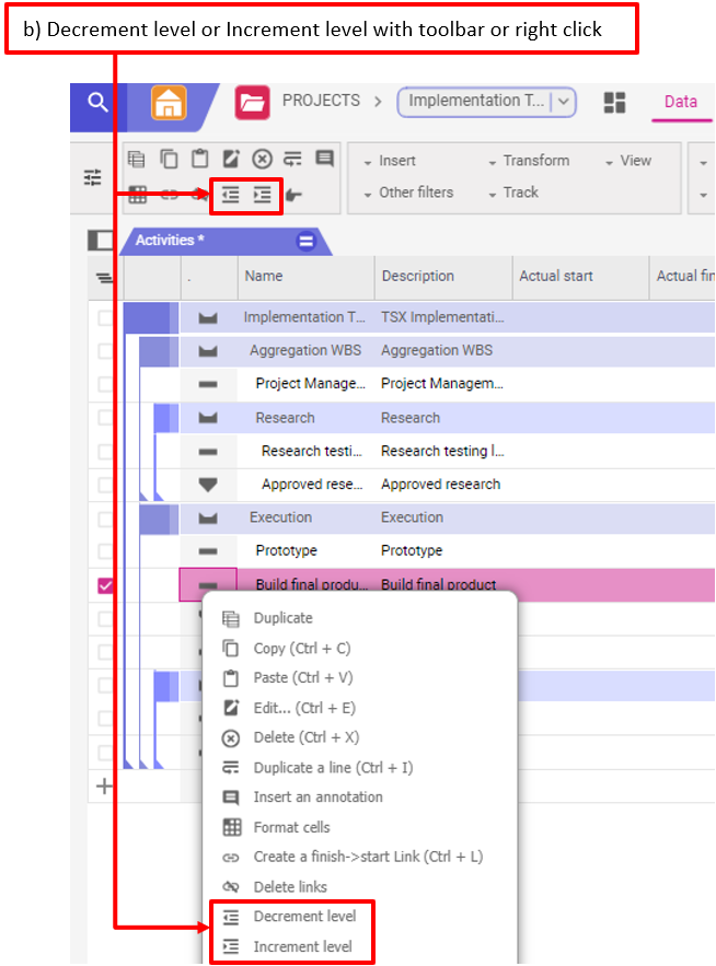 b) En cliquant sur Décrémenter le niveau ou Incrémenter le niveau dans la barre d’outils ou en cliquant avec le bouton droit de la souris, vous pouvez modifier le niveau des activités. Une tâche sera automatiquement transformée en sous-projet (WBS element) dès que vous incrémentez le niveau de l’activité en dessous.