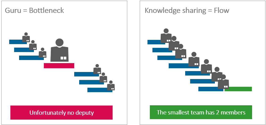 Yet, this will only work if you really share the knowledge. Hence, the actual number of people is not the problem but the bottlenecks for certain skills.