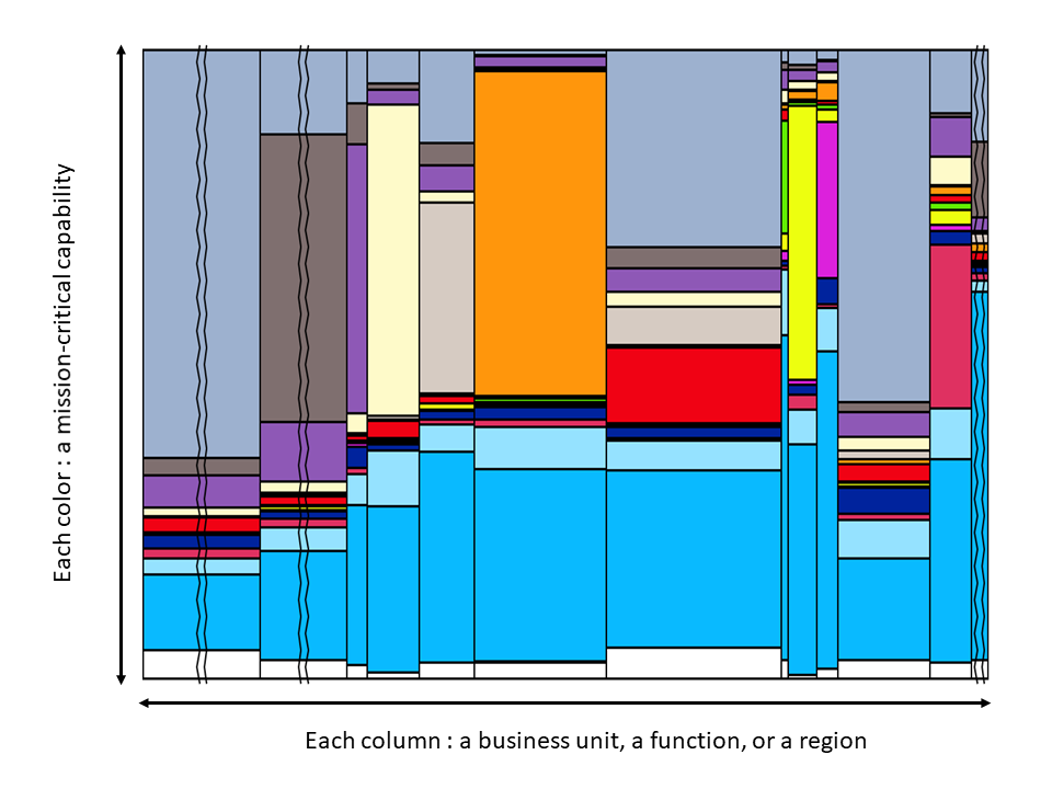 Here is a practical example. A Global 500 company wanted to focus its teams on customer-centricity. The above graphic shows the mission-critical capabilities across the entire organization (a macro-view) required to deliver successfully such a transformation that included employee training, new information systems, and new processes.