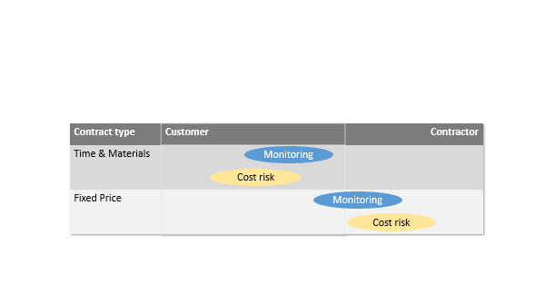 | Time & Materials | Payment and invoicing based on expenses incurred. The contractor is flexible as to the work to be performed, which is helpful for agile projects, but there is a risk that something can go wrong. | The client’s trust that the contractor will not abuse this relationship and assurance that this contract model will not be legally skewed to its disadvantage. | |