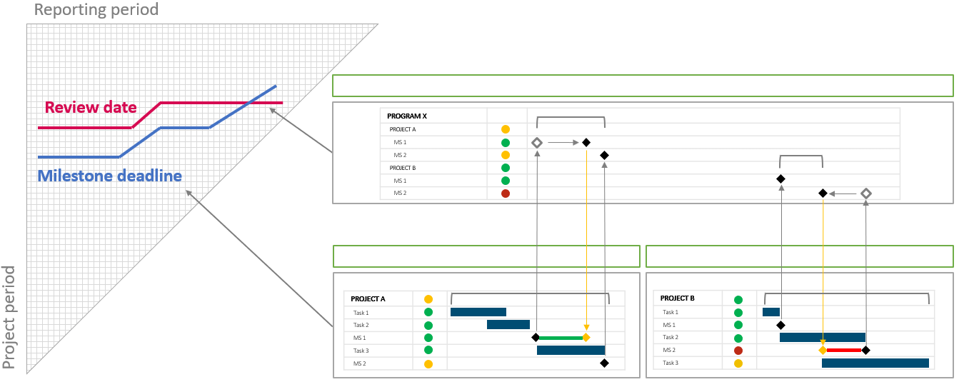 In program management, automatic synchronization with the program plan saves you a lot of time when project deadlines are postponed. Ideally, you would be able to simply open the program plan and immediately see the current status of every milestone alongside its planned status (cf. figure in Tip 6)