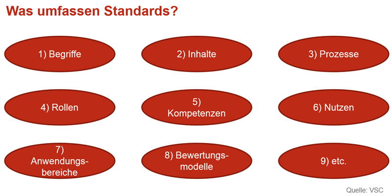 - Sicherheit: Standards helfen Personen zu entscheiden, ob sie eine Tätigkeit richtig ausführen. Das schafft Sicherheit und führt in die Richtung einheitlicher und vergleichbarer Ergebnisse.