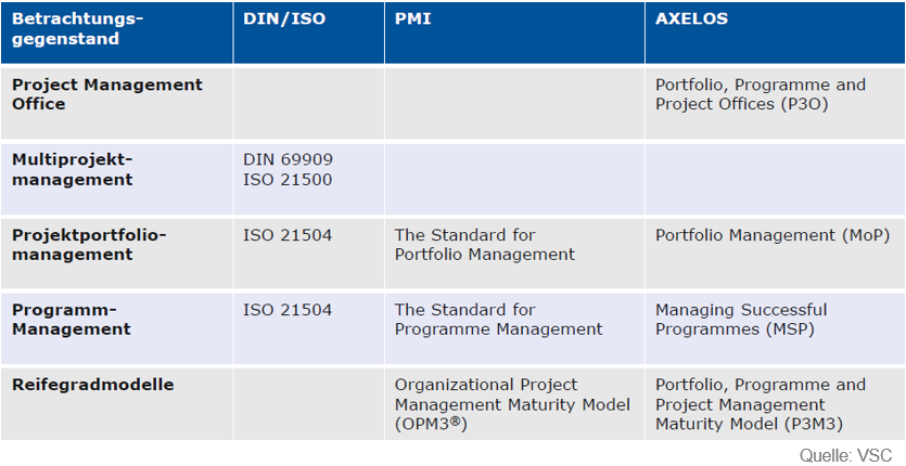 Es gibt in Deutschland verschiedene Standards im klassischen Projektmanagement. Die bekanntesten sind jedoch vorwiegend ausgelegt auf die Bereiche des Einzelprojektmanagements. Diese sind: