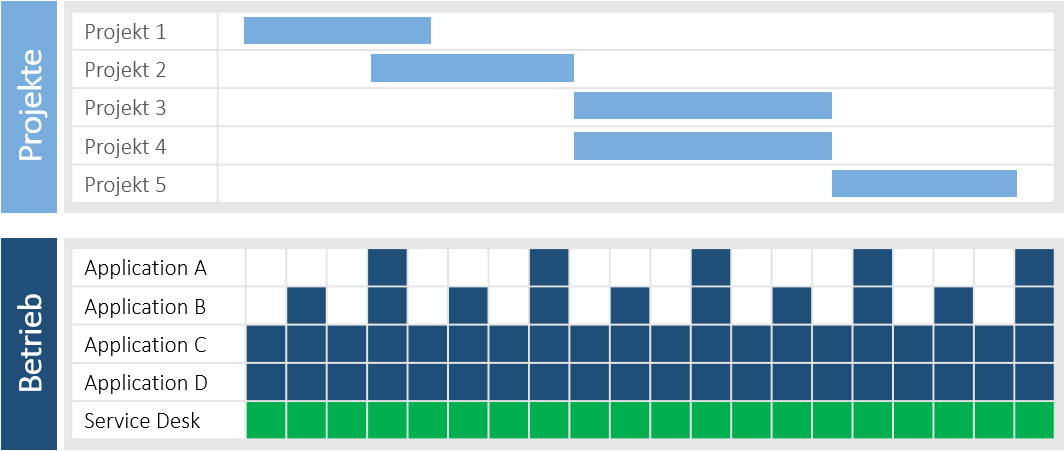Gerade in der IT ist es eine große Herausforderung, die vielen Linientätigkeiten für den Betrieb und die zusätzlichen Projekte mit derselben Mannschaft zu bewältigen. Das geht nur mit Hilfe einer vollständigen Gesamtauslastung des Teams. PPM-Tools sind für die Planung des Betriebs nicht geeignet und mit Excel ist das nur sehr begrenzt möglich.