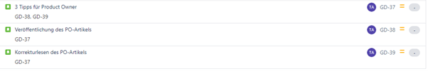 Hier wäre die Unterteilung in die einzelnen Arbeitsschritte erfolgt. Das kann zum Beispiel dann erfolgen, wenn unterschiedliche Teams an einer Story arbeiten. Oder wenn ein Teil für einen Sprint geplant wird und der Rest erst später. So könnte der Beitrag über mehrere Sprints hinweg entstehen und die Stories könnten einzeln abgeschlossen werden.