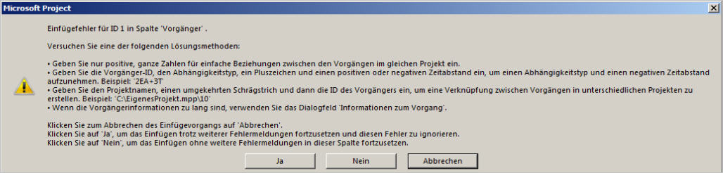 - Ja: Sie setzen das Einfügen trotz weiterer Fehlermeldungen fort (immer wieder mit „ja“ bestätigen). Dabei wird anschließend der Sammelvorgang samt Teilvorgängen und ohne Verlinkungen zu Vorgängern aus dem ursprünglichen Projekt eingefügt. (Achtung: Wenn Sie eine der Fehlermeldungen mit “nein” bestätigen, wird der Kopierprozess an dieser Stelle abgebrochen und nur ein Teil des kopierten Bereichs eingefügt.)