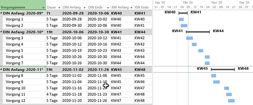 Durch die Darstellung der Datumswerte gemäß der ISO Norm lässt sich jetzt eine sehr interessante Gruppierung erstellen, die eine Darstellung der Vorgänge nach Beginn eines Monats zeigt. Die Lösung sieht dann so aus und wird anschließend beschrieben. Durch die neue Gruppierung können Sie Monate kompakt als Sammelvorgang wie „alle Vorgänge, die im November anfangen (DIN Anfang: 2020-11*)“ oder detailliert wie „alle Vorgänge mit DIN Anfang: 2020-10*“ anzeigen und drucken.