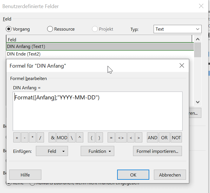 Im zweiten Schritt wird das DIN-Datenformat unter „Formel“ wie folgt beschrieben: Format([Anfang];“YYYY-MM-DD“).