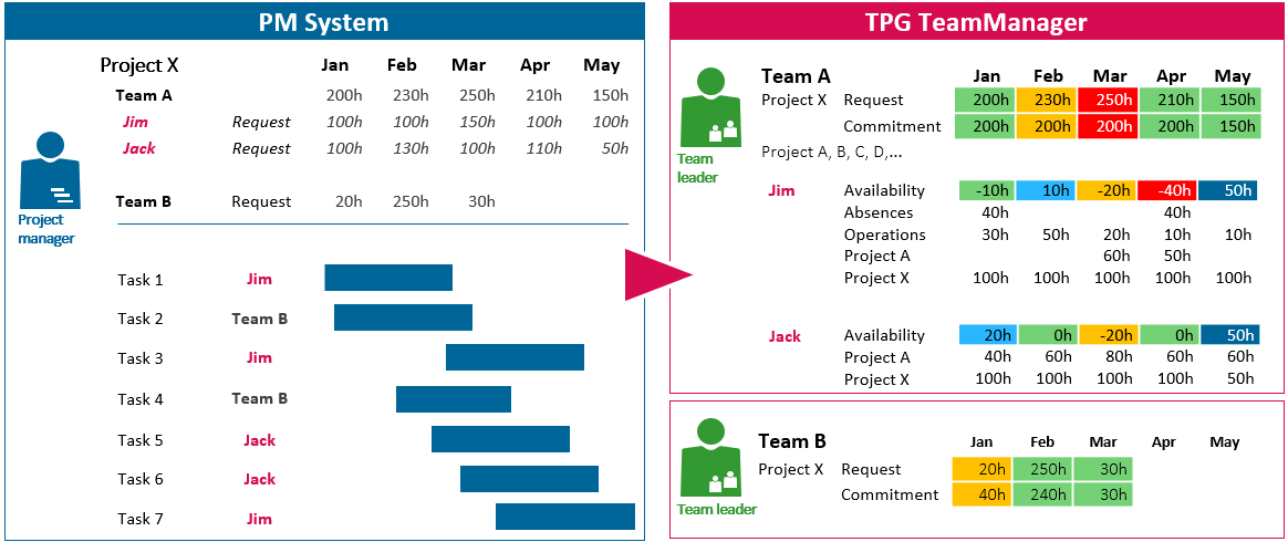 In most cases, traditional project management tools are inadequate for handling this. Why is this? Because the team leaders’ commitments are not maintained as an individual data pool. They are normally only marked with the status of the project or task.