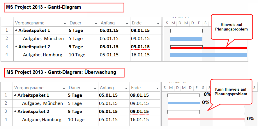 Achtung: In anderen Ansichten wie z.B. Gantt-Diagramm: Überwachung bzw. in älteren MS Project Versionen (z.B. 2010) gibt es keinen optischen Hinweis im Balkendiagramm.