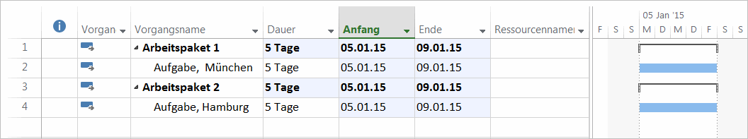 Sie arbeiten grundsätzlich mit der automatischen Planung. Dabei richten sich Anfang, Dauer und Ende eines Sammelvorgangs in MS Project nach den untergeordneten Vorgängen. Sie merken aber trotzdem Unterschiede zwischen dem Sammelvorgang und der Vorgänge.