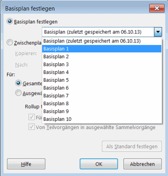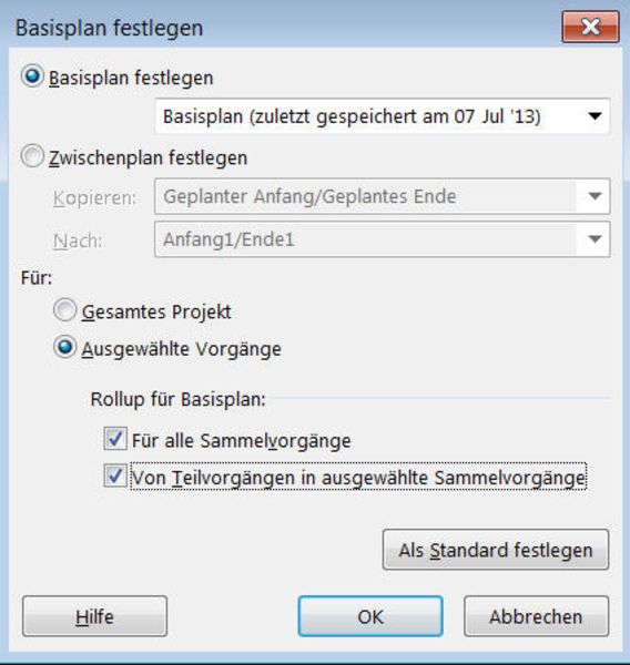 Wählen Sie Basisplan festlegen und Basisplan sowie Für ausgewählte Vorgänge.