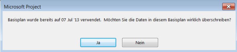 Dafür wählen Sie im Menüband Projekt / Basisplan festlegen / Basisplan festlegen den zu überschreibenden Basisplan sowie Gesamt Projekt. Bestätigen Sie mit OK bestätigen und beantworten Sie die anschließende die Frage mit Klick auf JA.