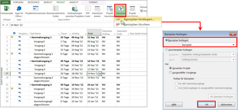 Im Menüband Projekt klicken Sie auf Basisplan festlegen und wählen Basisplan festlegen… im Menü aus. Wählen Sie Basisplan festlegen und Basisplan sowie Für Gesamtes Projekt aus und bestätigen Sie mit OK.