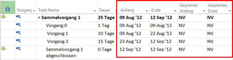 Microsoft Project bezeichnet diese Werte als „geplant“. Daher finden Sie die entsprechenden Sollwerte in den Spalten Geplanter Anfang, Geplantes Ende, Geplante Dauer, Geplante Arbeit und Geplante Kosten., nachdem Sie Ihren MS Project Basisplan gespeichert haben.