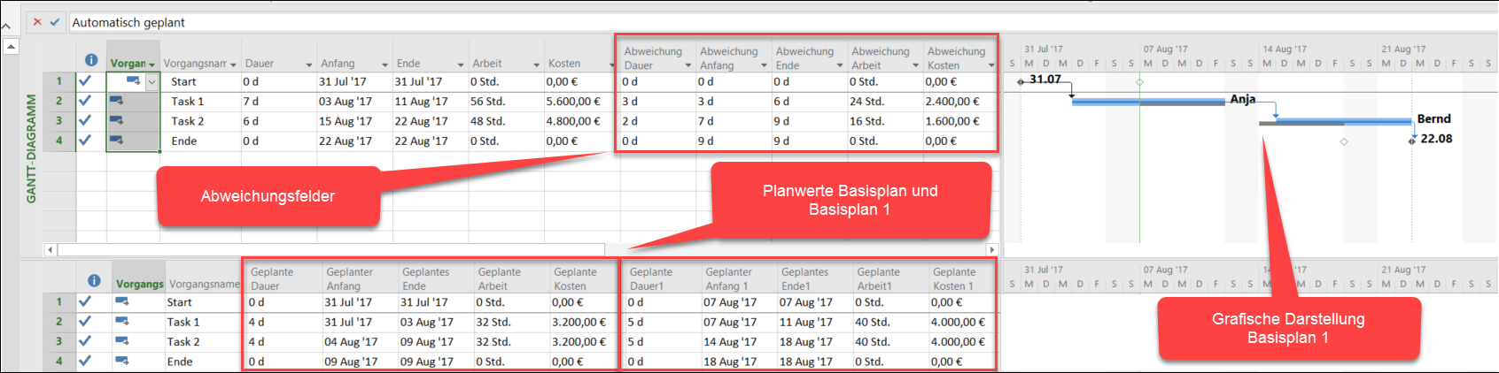Sie können die berechneten Werte mit Basisplan 1 vergleichen, indem Sie die entsprechenden Spalten wie z.B. Kosten und Geplante Kosten 1 einblenden. Oder wählen Sie in der Ansicht Gantt-Diagramm Überwachung den Basisplan 1 (Menüband Format/Basisplan/Basisplan 1 im Menü).