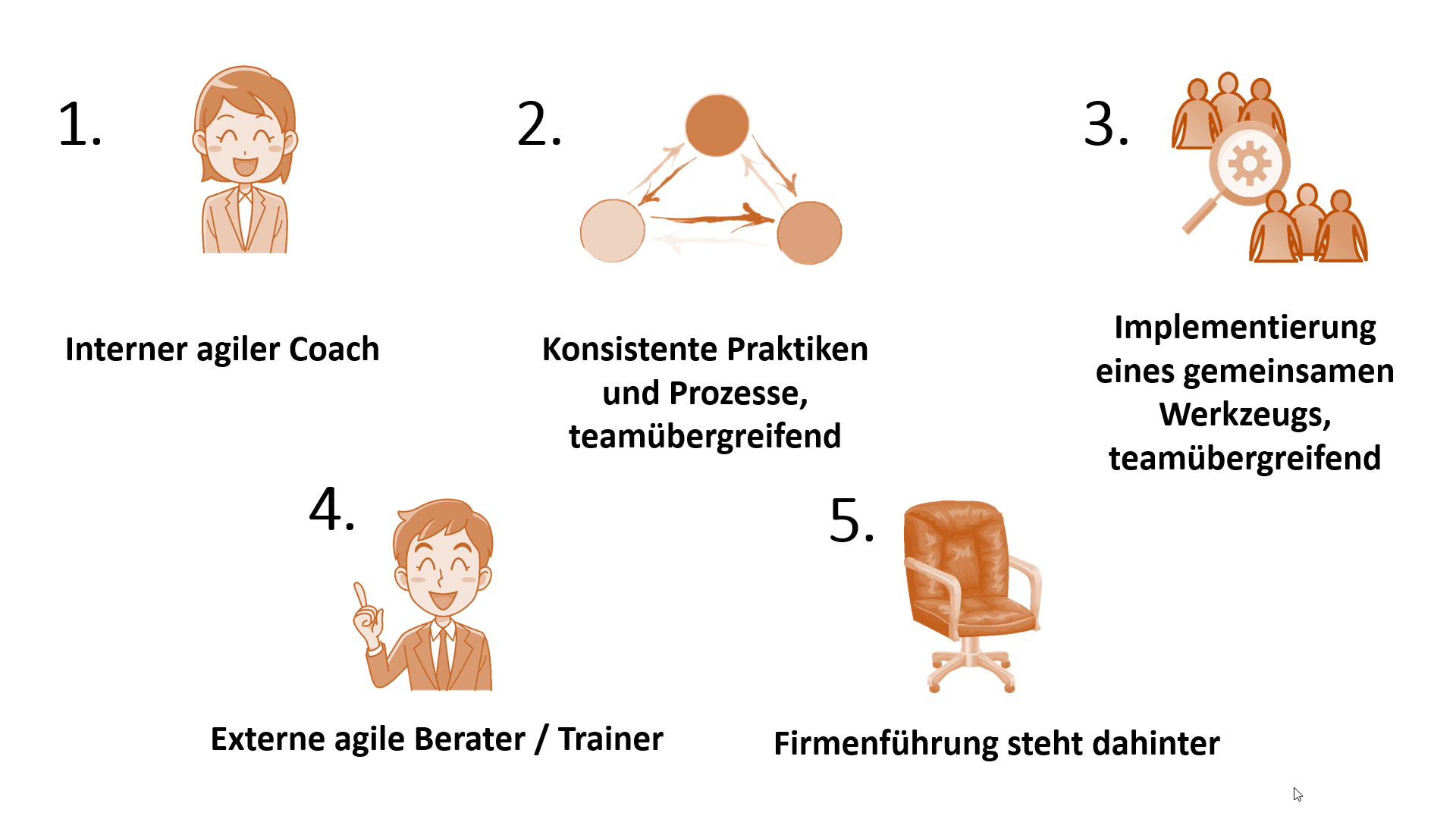 Der „State of Agile“-Bericht nennt bei der Einführung von Skalierungs-Frameworks die folgenden fünf Top-Erfolgsfaktoren: