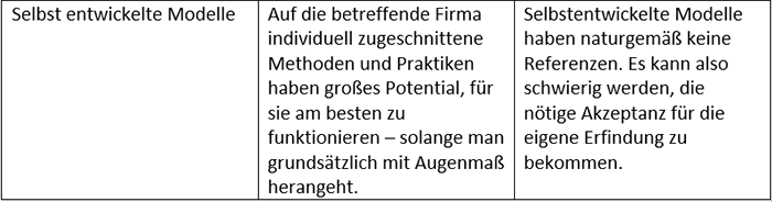 Tipp: Die Frameworks in dieser Liste können zur Orientierung und Inspiration dienen; eine Umsetzung sollte aber immer mit Augenmaß dank entsprechender Erfahrung oder Beratung erfolgen. Auch unternehmensweite Ziele sollten Sie zunächst ausarbeiten und kommunizieren, damit sich keiner der Betroffenen überrumpelt fühlt.
